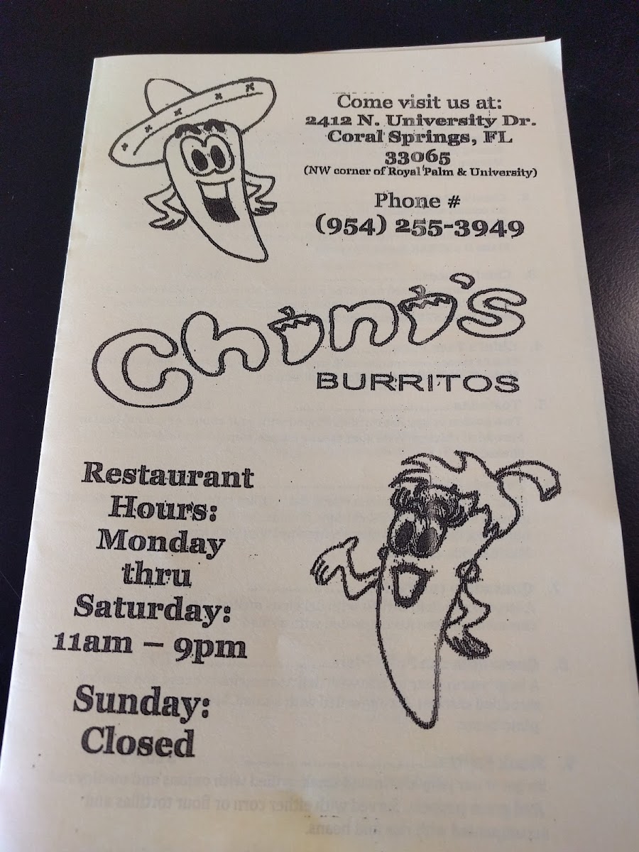 Welcome to Chini's Burritos, a hidden gem located at 2532 N University Dr, Coral Springs, FL. This cozy eatery, celebrated for its authentic Mexican flavors, offers a menu that will excite any burrito lover. A standout is the Original Burrito, beautifully stuffed with seasoned steak, pinto beans, and fresh ingredients, making each bite a delightful experience.